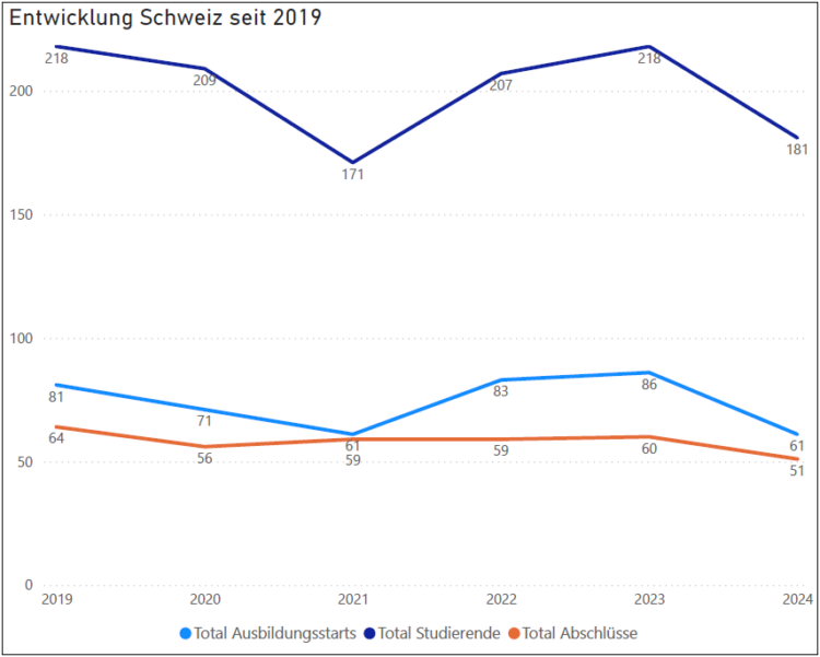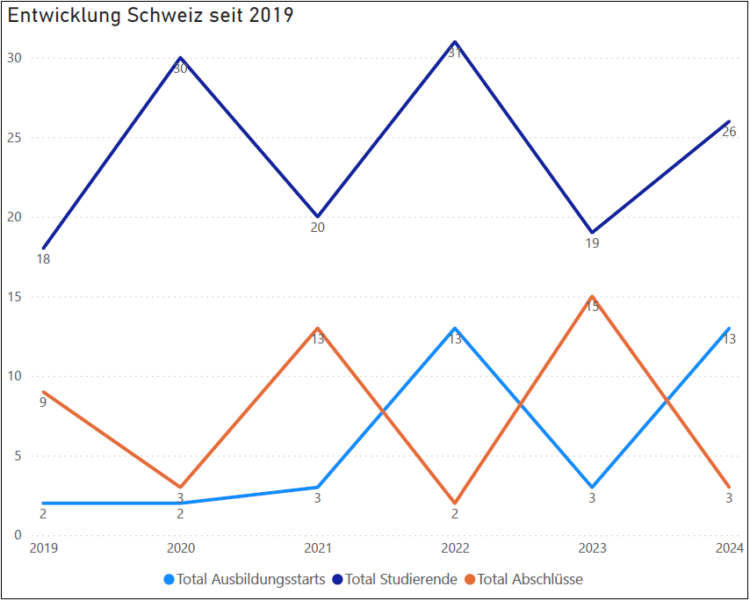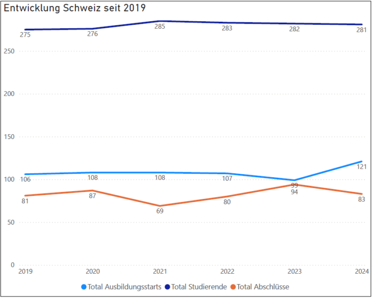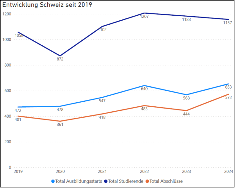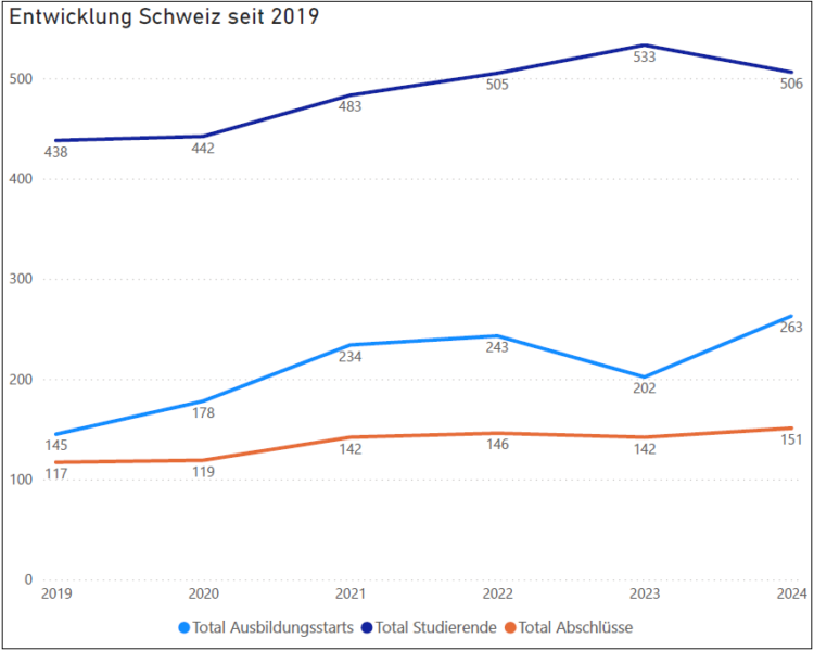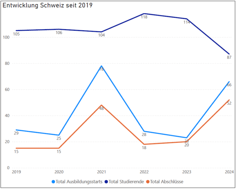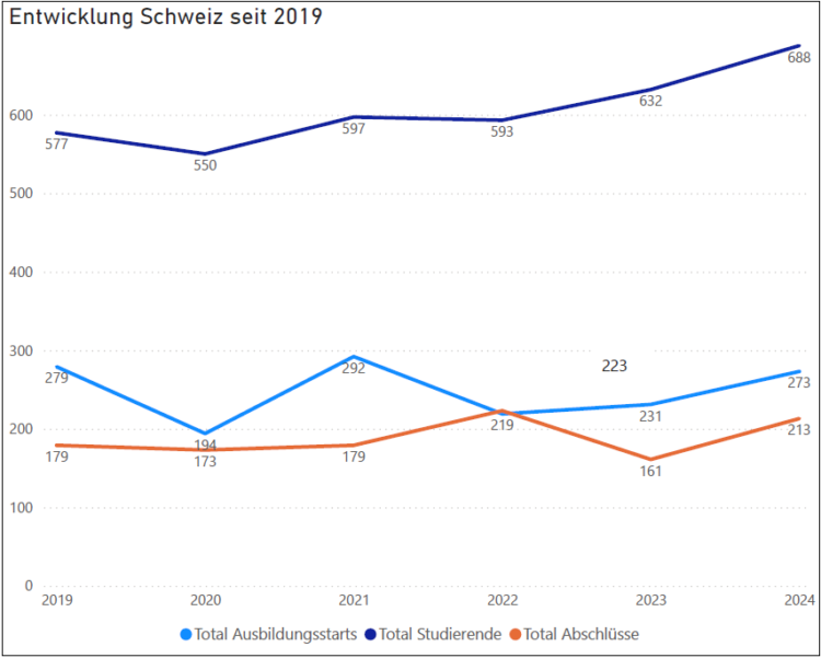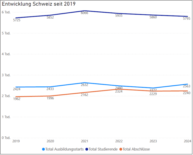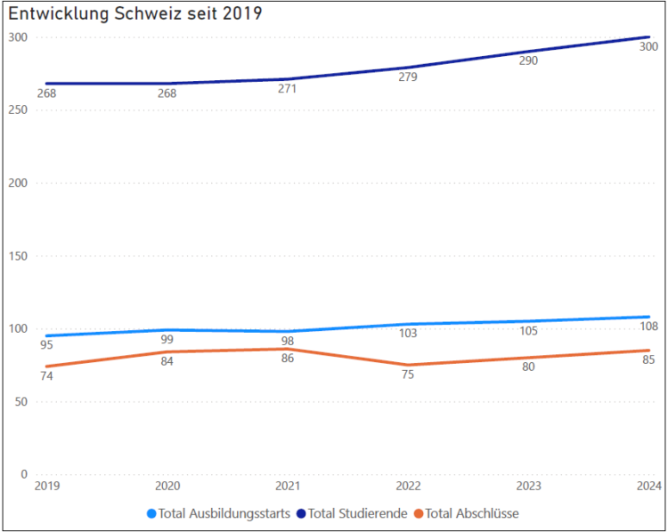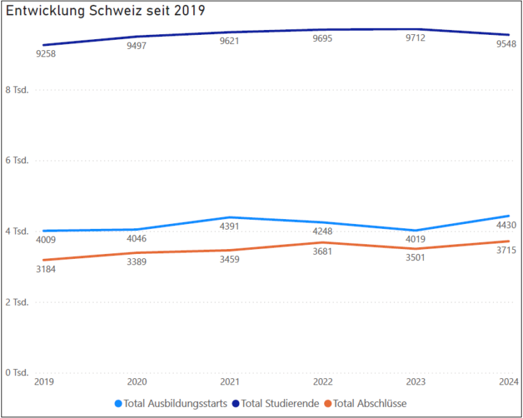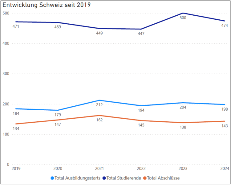 Der BGS erhebt jährlich bei seinen Mitgliedern Ausbildungsdaten. Die seit Jahren in derselben Form erfassten Kenngrössen Ausbildungsstarts, Anzahl Studierende sowie Abschlüsse bilden gemeinsam einen robusten Indikator zur Beschreibung des aktuellen Zustands des Ausbildungswesens im Bereich der Gesundheitsberufe. Gleichzeitig können die Daten als Indikator für die Entwicklung der Gesundheitsversorgung in der Schweiz betrachtet werden.